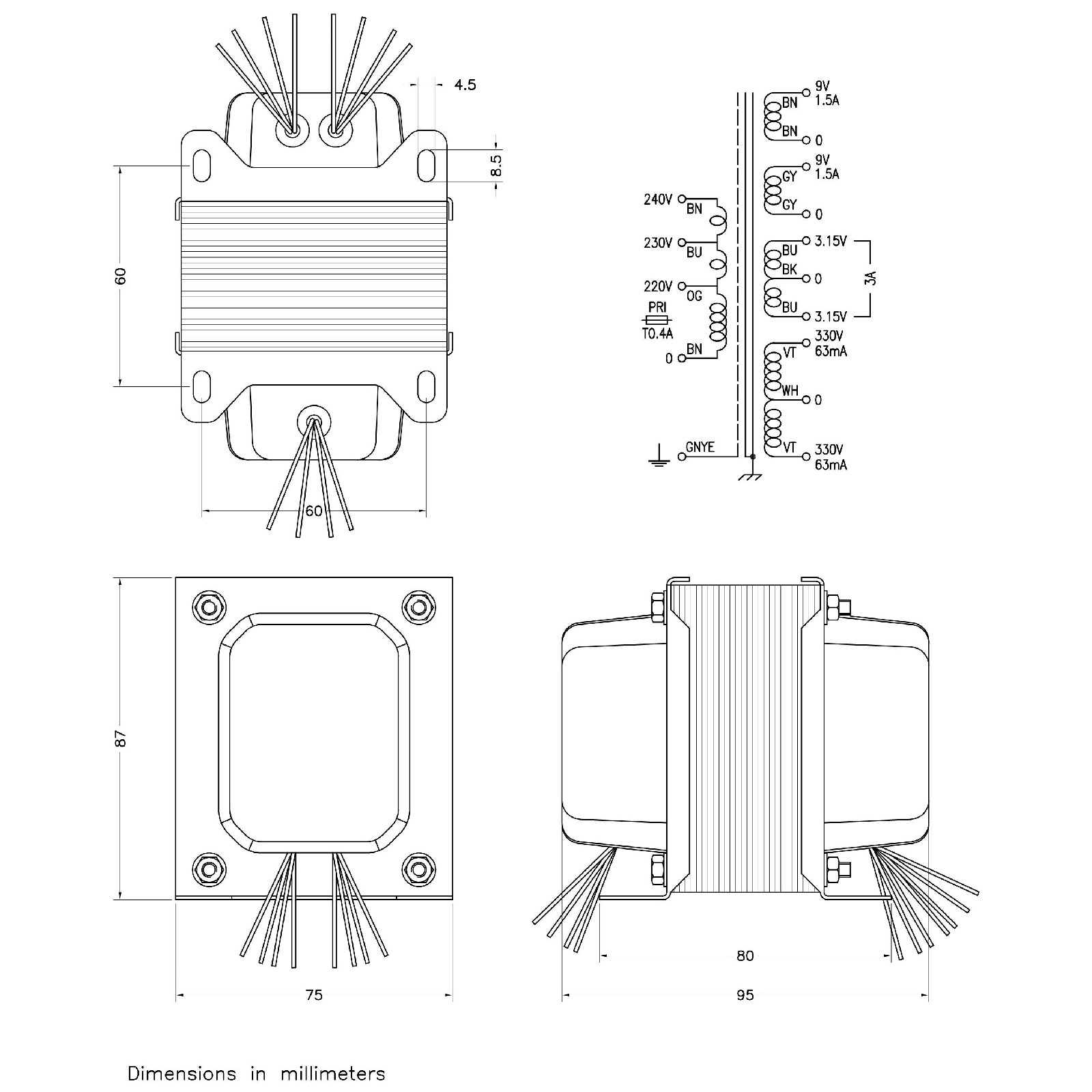 330-0-330 0.063A, 2x9V 1.5A, 6.3V 3A