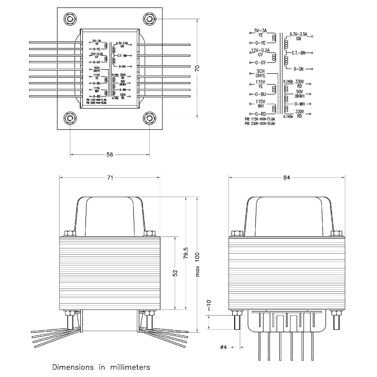 6.3V CT 3.5A, 5V 3A, 12V 0.2A